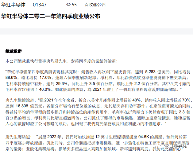 全球排名第五的华虹半导体,去年第四季度业绩表现极其亮眼:销售收入达到5.283亿美元,同比增长88.6%,连续六个季度刷新纪录。公司称,未来将加快推进12英寸生产线总产能至94.5K的扩产,预计将于第四季度逐步释放产能。