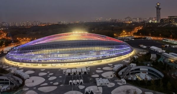 国家速滑馆(冰丝带)是本届冬奥会唯一新建的冰上竞赛场馆,将举办速度滑冰项目比赛,项目用地为2008年奥运会射箭场和曲棍球场。建设时通过巧妙设计,它大幅减少了钢材的使用,同时减少了能源消耗;施工过程中654根废弃桩头用于制作混凝土看台板,实现资源循环利用。