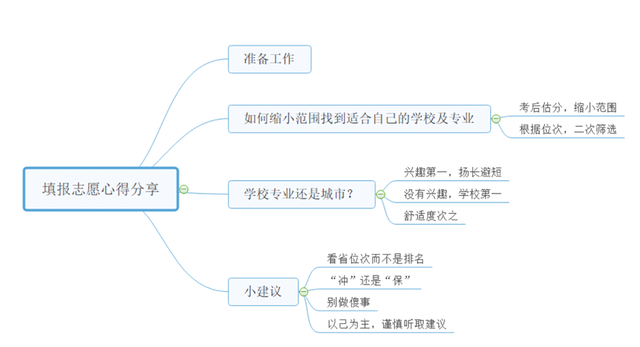 答主清玄总结了一份填报志愿心得思维导图。从前期报考指南、招生简章的规则解读,到后续的估分,如何选择,以及报考小贴士,梳理出了一整套流程。