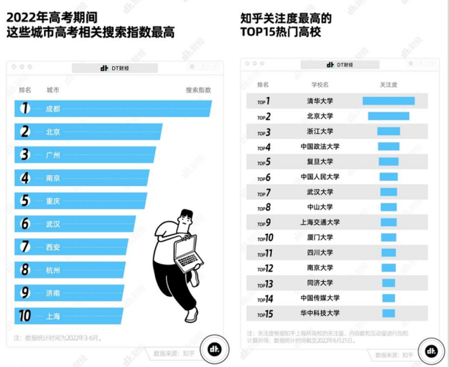 其中,从地域上看,成都的高考搜索热度最高,北京、广州、南京和重庆紧随其后;从高校上看,清华大学、北京大学、浙江大学、中国政法大学、复旦大学是知乎用户关注度最高的5所高校。