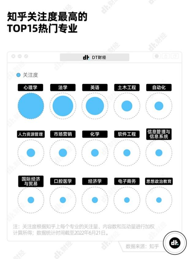 值得注意的是,在知乎关注度最高的热门专业排名里,最受大家欢迎的专业不再是现在就业强势、薪资霸榜的计算机、人工智能、金融等专业,而是心理学、法学、英语、土木工程、自动化等专业,热度值遥遥领先。