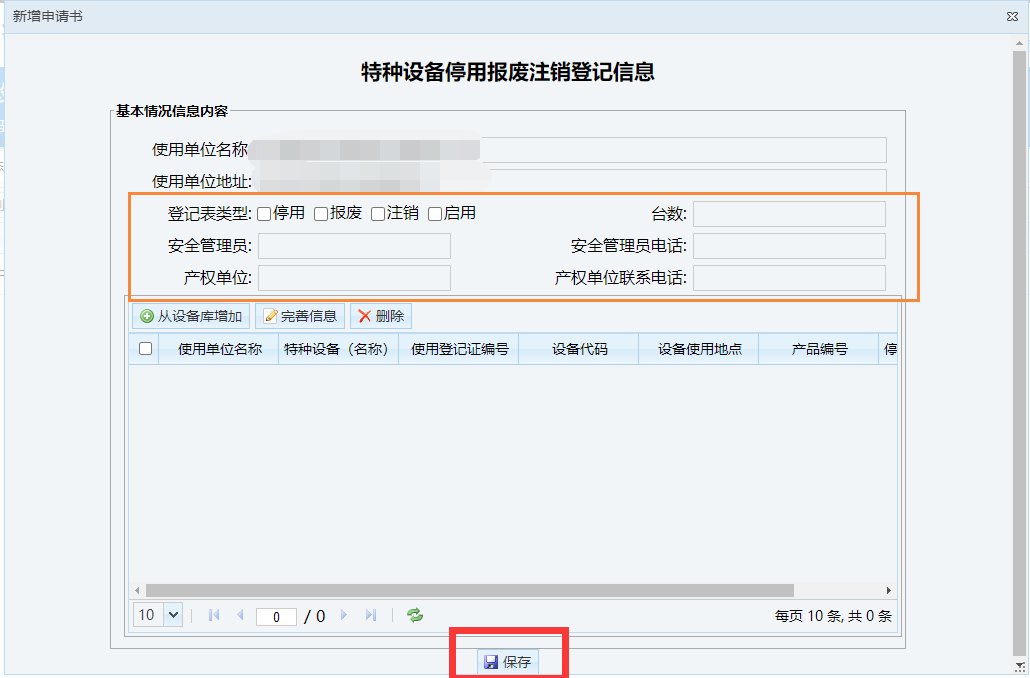 勾选登记表类型、填写方框内的信息,然后点击保存按钮