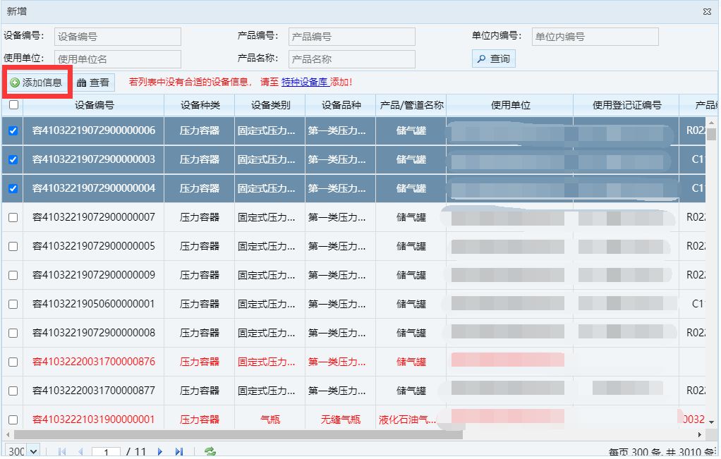 点击从设备库添加,选中需要变更的设备,点击添加信息按钮