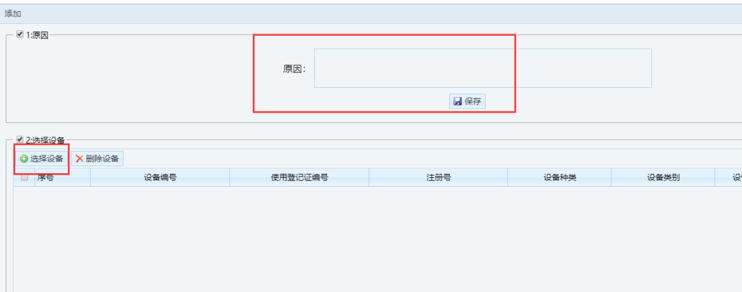 点击设备上报按钮,点增加,填写原因后点保存,选择设备信息之后关闭当前页面,内容填写没什么问题就可以点上报,上报之后状态会变成审核中,设备状态变成已审核就可以办理变更或者注销了