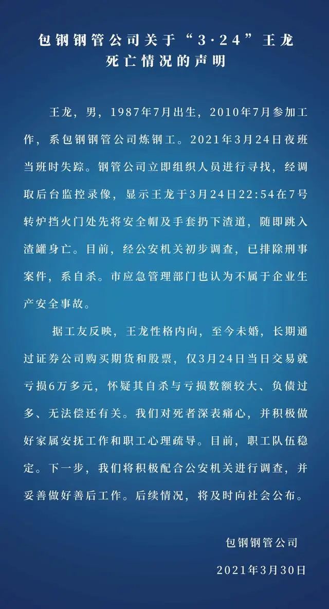 原标题:痛心!包钢集团突发通报 职工跳入高炉钢水中身亡:疑与证券亏损大、无法还债有关 监控记录跳炉最后瞬间:一下就没了 来源:21世纪经济报道