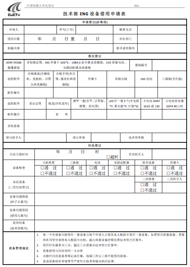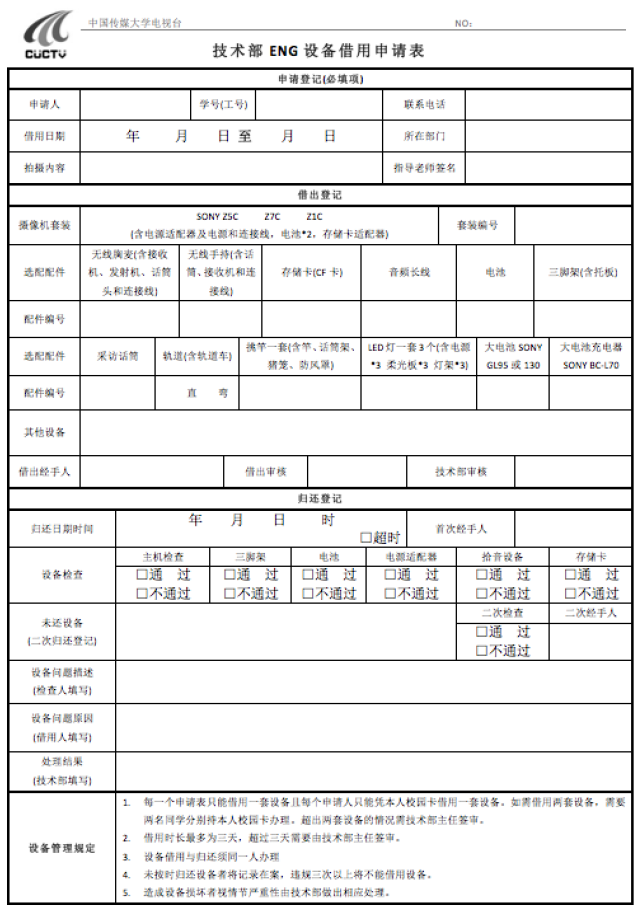 一、设备借用人来116值班室领取申请表或者自行打印(如借2套以上设备请事先向技术部主任申请,得到允许后再来领取表格);