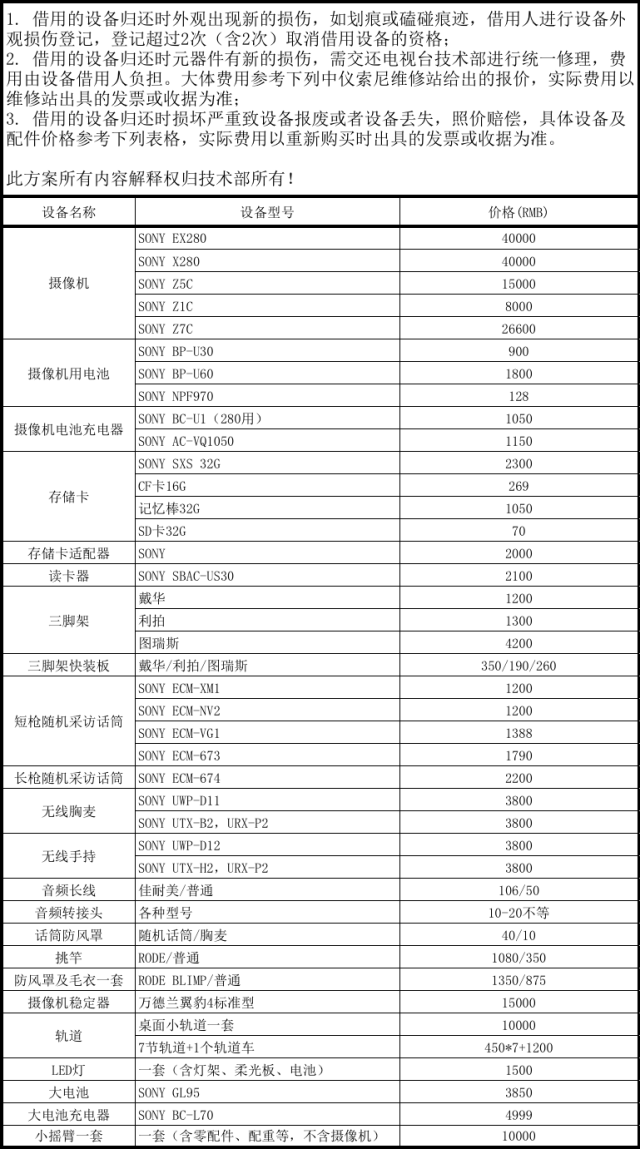 五、如果设备或配件有损坏及包袋有不正常损坏的情况,需要在表格中进行相应的问题登记并由相应借用人签字确认,具体处理方法见赔偿方案。