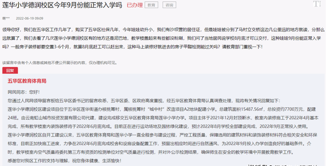 该网友表示:去看了几次莲华小学德润校区,有的地方还是泥巴地,教学楼盖起来后有些都没粉刷。问了当地居民说,学校8月底才可以交付,娃娃9月份能正常入学。一般房子装修都要空置3-6个月,就算8月底赶工出来,房子的甲醛检测能过关吗?