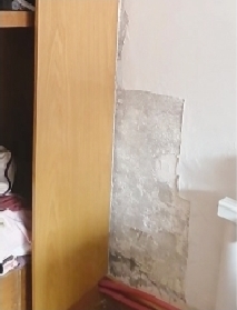 王阿姨说,家里的衣柜正好贴着这面墙,最开始墙皮脱落,后来衣柜里返潮,衣服、被褥都长毛了。