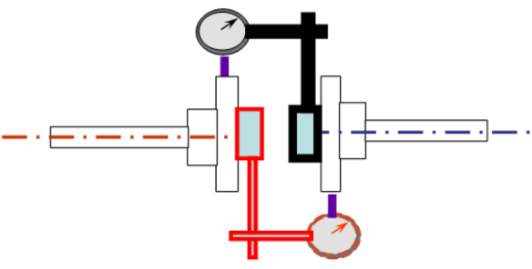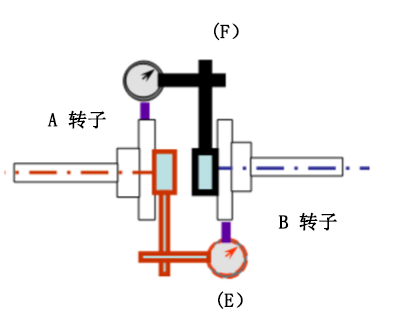 当把表架固定在A转子的轴头上,表杆头触到B转子的联轴节的外圆上时,如(E)所示,叫A打B,记A→B。当把表架固定在B转子的轴头上,表杆头触到A转子的联轴节的外园上时,如(F)所示,叫B打A,记B→A。