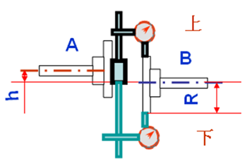 如图所示:以垂直方向为例,假设A、B两转子的高低差为h,联轴节的外圆半径为R。