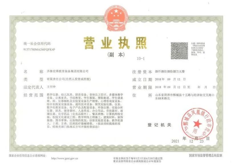 齐鲁宏博教育装备集团有限公司,原齐鲁宏博科教仪器有限公司成立于 2010 年,注册资本 8888 万元,公司坐落于千年古县孙膑故里一山东鄄城。具有十余年生产制造经验,是一家集研发、设计、生产、销售、安装、 服务于一体的专业化教学仪器设备生产型企业。主要生产销售中小学教学仪器、实验室成套设备、音体美卫劳器材等,是目前中国教育装备行业一体化解决方案专业化供应商。