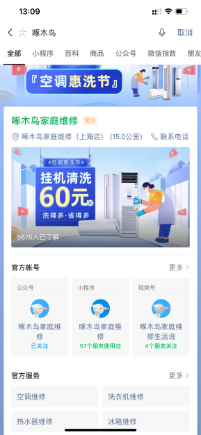 今年,啄木鸟将搜一搜官方区也作为了品牌营销活动的重要阵地之一。比如四月上线的空调惠洗节活动,在官方区搭建了活动专场,预热并承接初夏高峰需求。