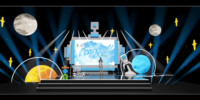 2022动听中国话全国总盛典舞美设计全新升级。融入星空、星球、飞船等元素,搭配酷炫多变的舞台灯光,渲染梦幻的氛围,营造未来的科技感。