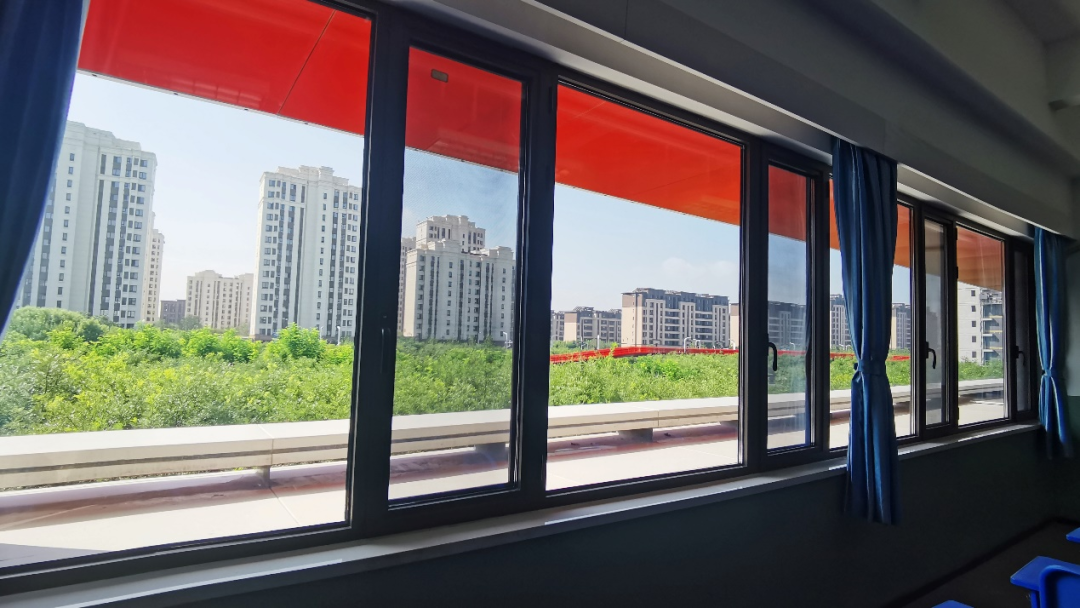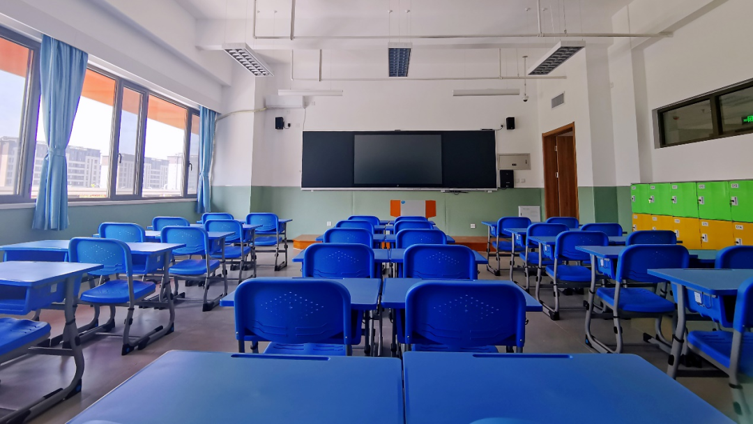 走入教室的第一感觉就是宽敞和明亮,深蓝色的桌椅,色彩丰富的储物柜,以及看向窗外就能尽收眼帘的美景,为学生们营造了十分舒适的学习环境。