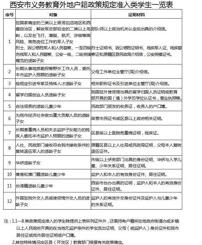 附件2:西安市义务教育外地户籍政策规定准入类学生一览表