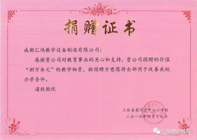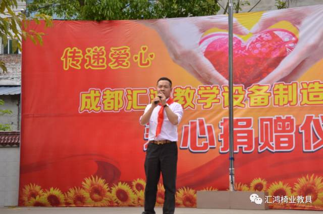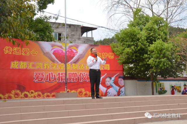 4月19日下午,阳光明媚,三台县菊河乡中心小学沐浴在一片暖暖的春意之中。操场上举行一场隆重的捐赠仪式,这场捐赠仪式由成都汇鸿教学设备制造有限公司发起,向四川省三台县菊河乡中心小学捐赠课桌椅、办公设备、文件柜等八万余元的教学物资。