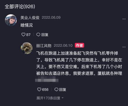 网友丽江风物在短视频平台发布的视频及留言回复显示,6月9日下午该乘客乘坐MF1356航班(系共享航班,实际承运为南航CZ3488航班)从丽江飞往广州,飞机在跑道上加速准备起飞,突然(疑似)有飞机零件掉了,听到像汽车爆胎一样的声音后,飞机晃了几下停在跑道上。