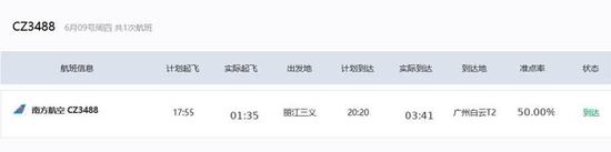 南航航班信息显示,该航班计划起飞时间为6月9日17:55,实际起飞时间为6月10日1:35。实际起飞时间延误7小时40分钟。航班信息平台Variflight显示,航班延误原因是天气原因;10日凌晨,上述旅客收到的航空公司短信也称是天气原因导致航班延误;大众网·海报新闻记者致电南方航空公司,客服工作人员也称航班延误是天气原因。然而,记者致电丽江机场询问该航班延误原因时,工作人员称CZ3488航班延误是(航空)公司原因,机械故障。