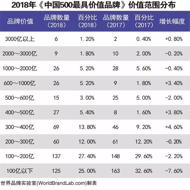 报告显示,2018年度中国500最具价值品牌的总价值为184459.11亿元,比去年增加28879.05亿元,增加幅度为18.56%。世界品牌实验室主席、诺贝尔经济学奖得主罗伯特·蒙代尔教授(RobertMundell)说,人工智能、大数据和区块链等新技术,给品牌成长带来新的希望。世界品牌实验室编制中国品牌报告已是第15个年头,2004年入选门槛仅为5亿元,前500名品牌的平均价值为49.43亿元。15年以后的2018年,入选门槛已经提高到23.52亿元;而前500名品牌的平均价值高达368.92亿元,增加幅度为646.35%。