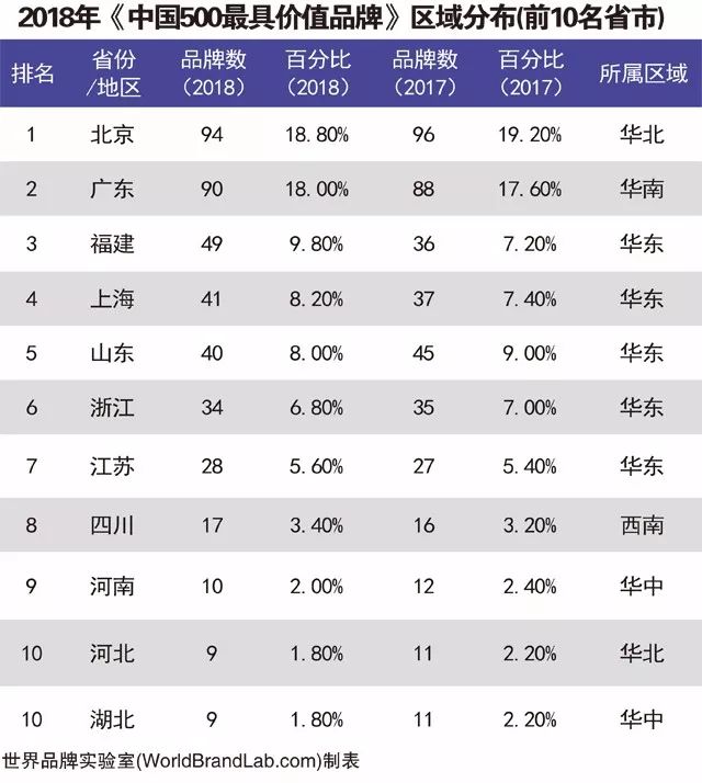 据世界品牌实验室分析,一个区域的竞争实力,主要取决于其比较优势,而品牌效益直接影响着地区比较优势的形成和发展。与企业品牌一样,区域品牌具有竞争性和排他性。一个区域内的超级品牌集中,就容易形成品牌集群效应。从本届《中国500最具价值品牌》区域分布来看,北京有94个品牌入选,名列第一,主要原因是赢利能力强的央企总部集中在北京;广东和福建分别有90个和49个品牌入选,位居第二和第三。根据入选品牌影响力范围大小,按照区域性、全国性和世界性对品牌进行划分。榜单中具有全国范围影响力的品牌有439个,占87.80%;具有世界性影响力的品牌数为51个,这一数据比去年有所提高。