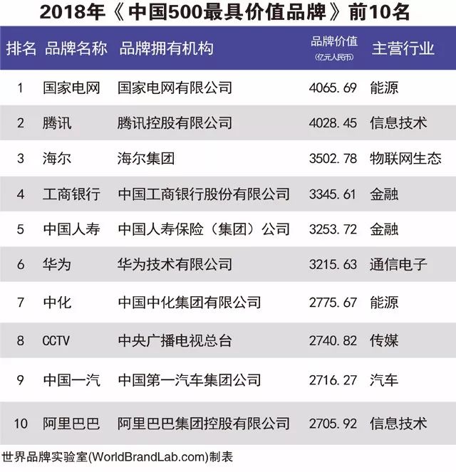 由世界品牌实验室(World Brand Lab)主办的(第十五届)世界品牌大会于6月20日在北京举行,会上发布了2018年《中国500最具价值品牌》分析报告。在这份基于财务数据、品牌强度和消费者行为分析的年度报告中,国家电网以4065.69亿元的品牌价值荣登本年度最具价值品牌榜首。占据榜单前五名的还有腾讯(4028.45亿元)、海尔(3502.78亿元)、工商银行(3345.61亿元)、中国人寿(3253.72亿元),这些品牌已经迈进世界级品牌阵营。