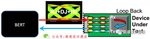 RX端主要是进行压力测试,包括垂直方向上的噪声压力和水平方向上的抖动压力。如下图所示,测试时需要将RX端芯片置于回环模式,将接收到的信号进行判决后再给TX发送出来检查是误码率是否满足要求。RX端接收的信号已经包含了人为制造的噪声和抖动压力影响。